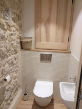 Disposition : en RDC, spacieux séjour avec cuisine ouverte équipée 28 m² et toilettes ; à l’étage, 2 chambres de 9.5 m² et 13.5 m², salle d’eau et 2ème toilettes.