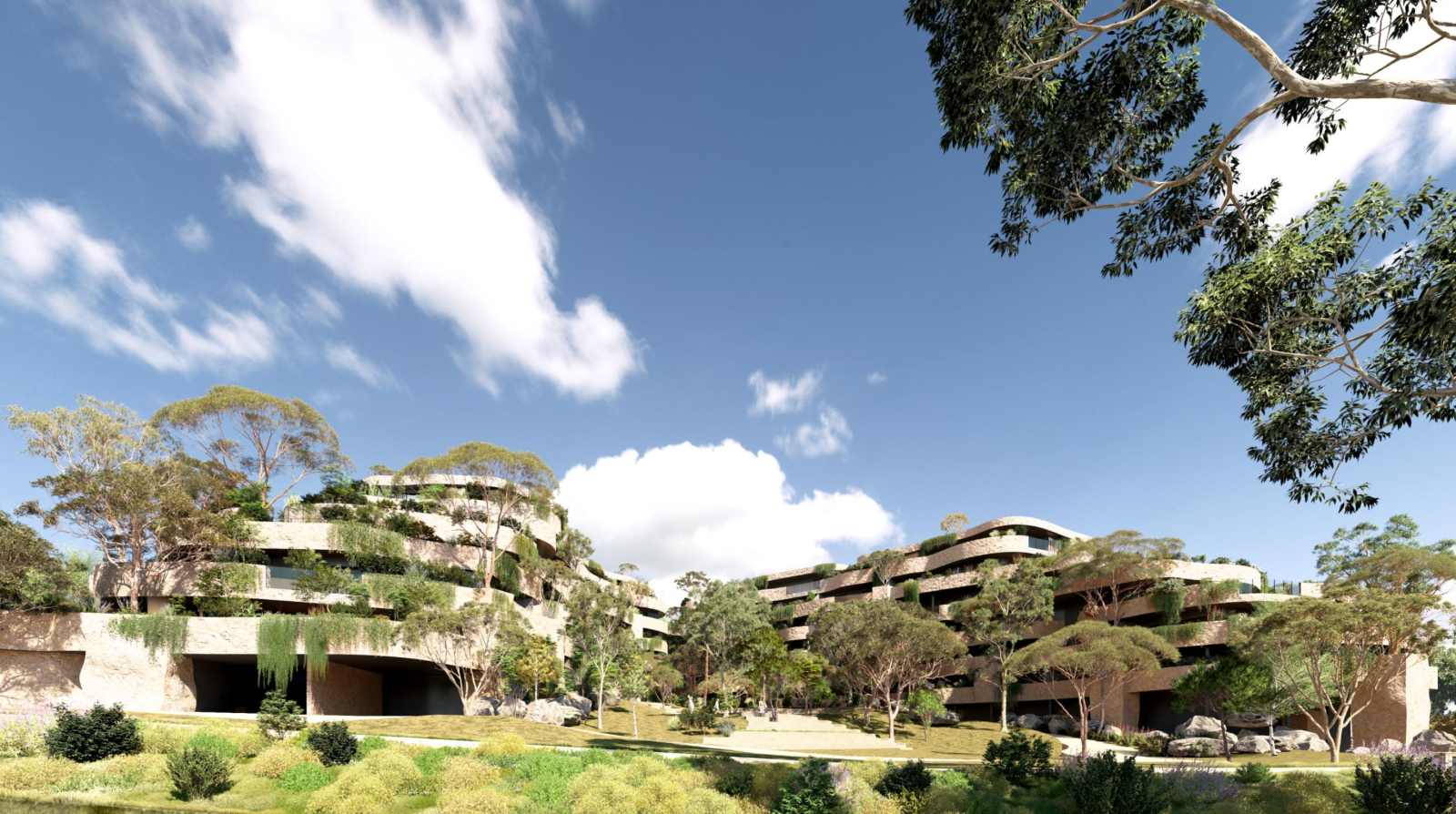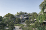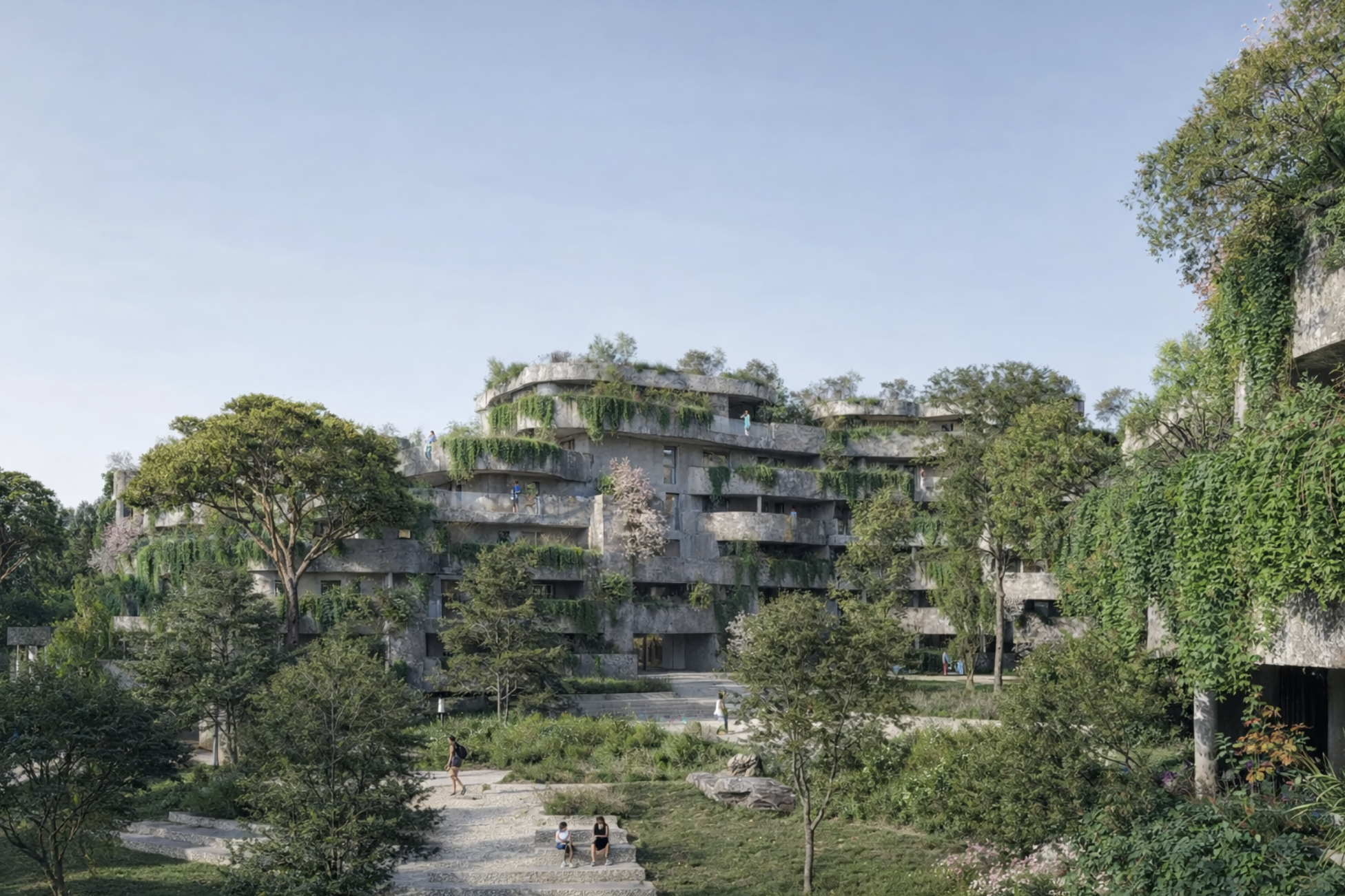 Le projet se distingue par une architecture singulière, aux lignes souples et organiques, qui s’intègre harmonieusement dans un environnement largement végétalisé. Les bâtiments s’organisent autour d’un cœur paysager généreux, créant une véritable respiration au sein du projet. La végétation omniprésente, les terrasses plantées et les cheminements doux participent à une atmosphère apaisante, pensée comme une continuité naturelle entre intérieur et extérieur.