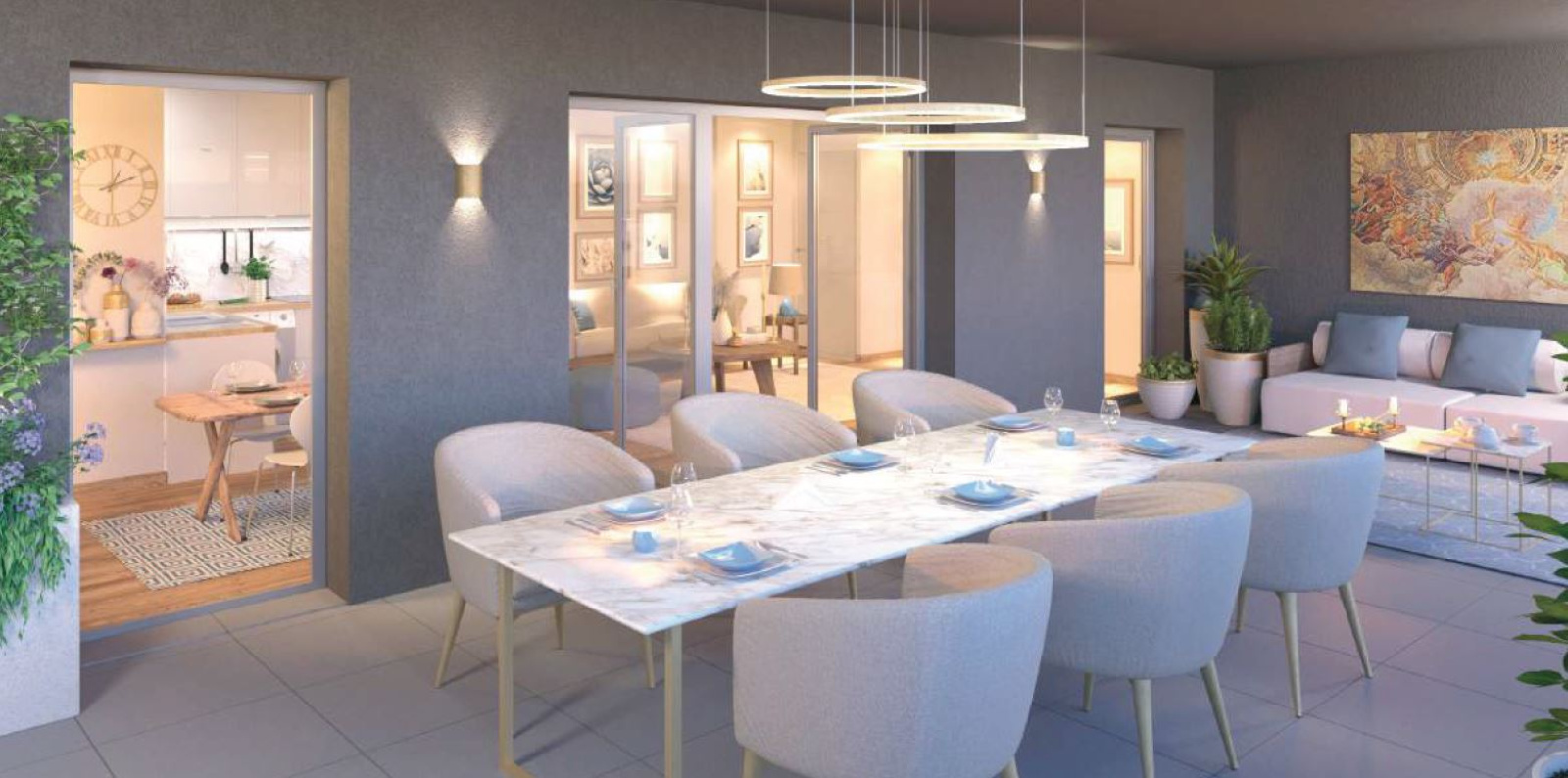 Une résidence qui décline une grande diversité de typologies d’habitat, quasi exclusivement traversantes ou multi-orientées dans une relation privilégiéeavec le grand paysage. Toutes les distributions s’articulent autour d’espacesextérieurs généreux qui faciliteront le lien social entre les habitants etouvriront des perspectives sur des espaces végétalisés.