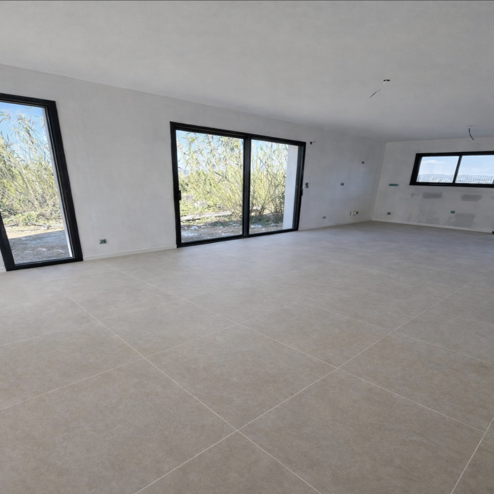 - Menuiseries de couleur gris anthracite avec volets roulants électriques intégrés pour l’ensemble de la villa avec des volets en bois persiennes pour les chambres,