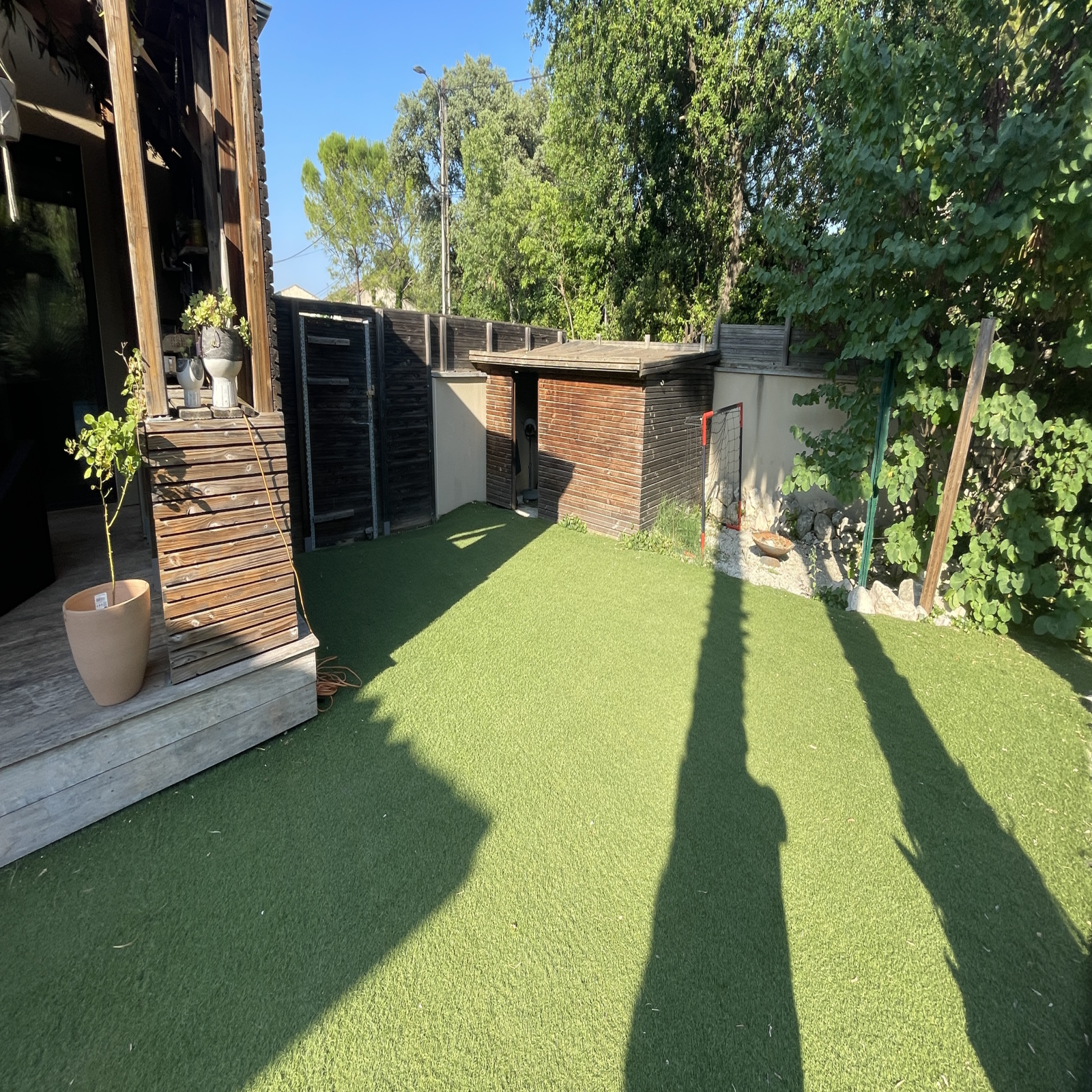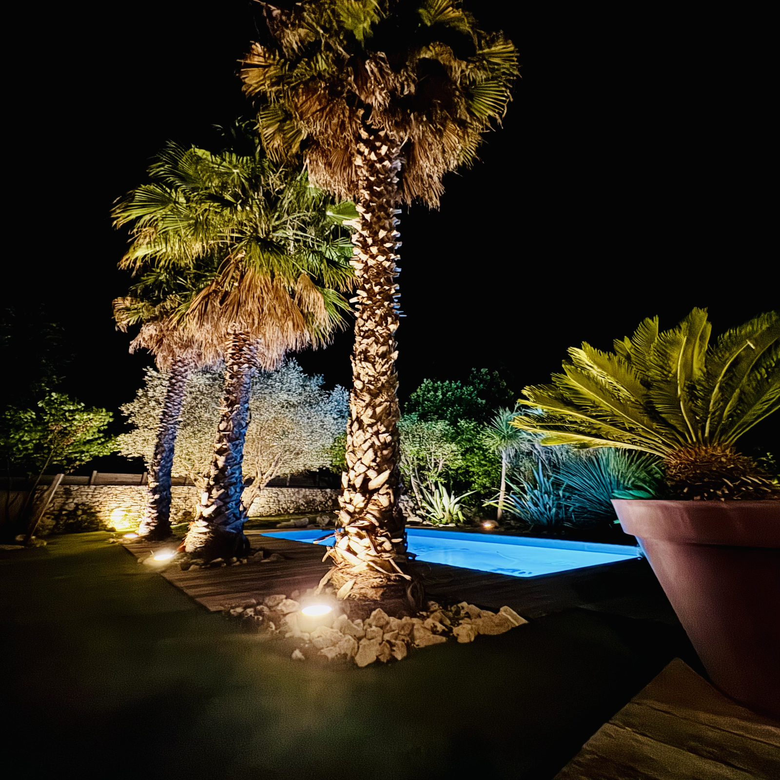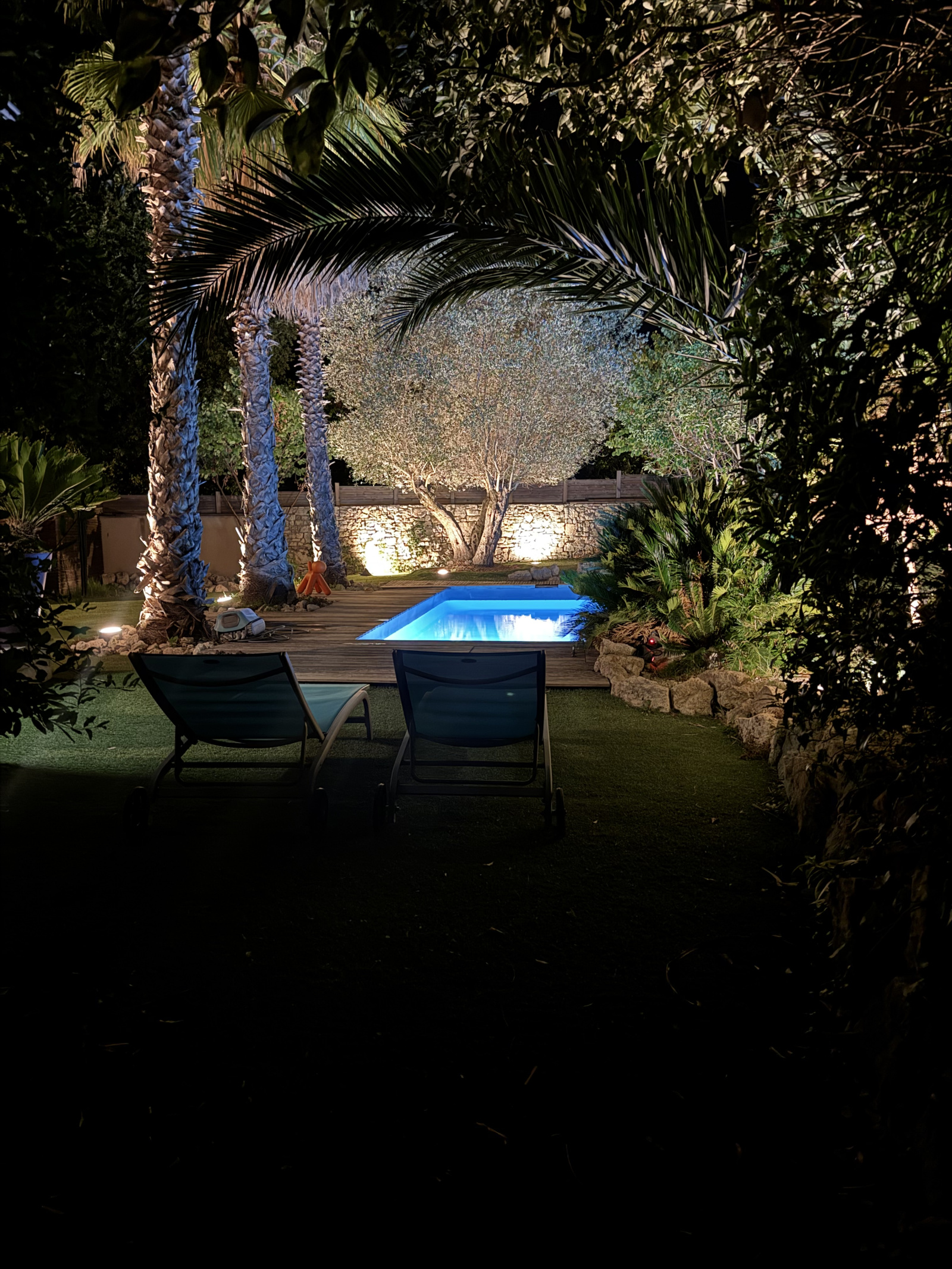 À l’extérieur, laissez-vous séduire par : une piscine élégante de 7m x 3.5m et 40m2 de plage bois; parfaitement intégrée au jardin paysagé unique, avec notamment des grands palmiers. Terrasse bois de 35 m². avec cuisine d’été , fontaine, et gazon synthétique pour un extérieur 100 % sans entretien… Abri jardin en bois de 9.5m2 pour un maximum de rangement .