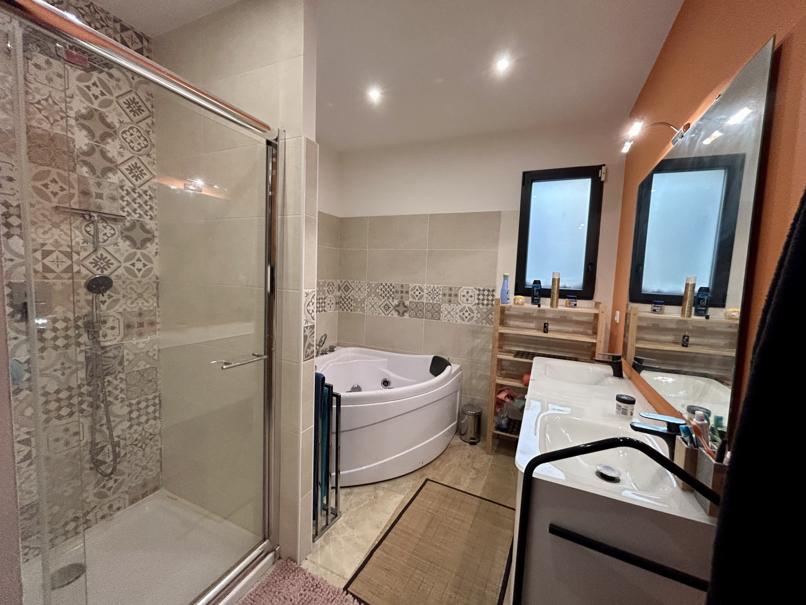 Grande et belle pièce de vie de 47m2, séjour et cuisine entièrement équipée, rétroprojecteur et hauteur sous plafond de 3m, cellier-buanderie aménagé de 6.5m2. Espace nuit avec 3 chambres dont 1 parentale avec salle d’eau privée, dressing,de 15.5m2 environ, etbaie coulissante accédant directement sur la terrasse. 2 chambres de 11.7m2 chacune, avec placards aménagés, dont 1 avec baie coulissante également et accès sur terrasse. Salle de bains aérée, avec douche et baignoire d'angle balnéo, meuble double vasque et sèche serviette. Toilettes suspendus et indépendants, avec lave main.